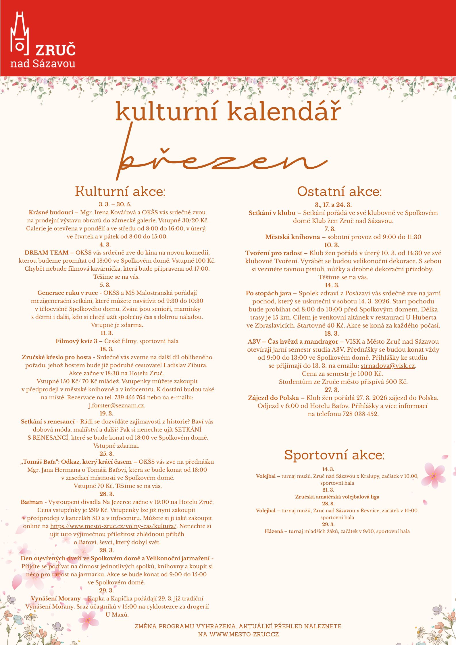 Zajímavé osobnosti přivede do Zruče oblíbený cyklus Zručské křeslo pro hosta – 18. března dorazí cestovatel Ladislav Zibura. Ve stejný den začne také nový semestr Akademie třetího věku. Historii přiblíží 19. března Setkání s renesancí a 25. března přednáška věnovaná odkazu Tomáše Bati. Závěr měsíce nabídne divadelní představení Baťman v podání Divadla Na Jezerce, Den otevřených dveří spojený s Velikonočním jarmarkem a tradiční Vynášení Morany, které symbolicky přivítá jaro.